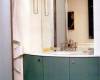 В ванной комнате навесная тумба -фасад алюминиевый профиль.