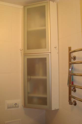 В ванной комнате навесная тумба -фасад алюминиевый профиль.