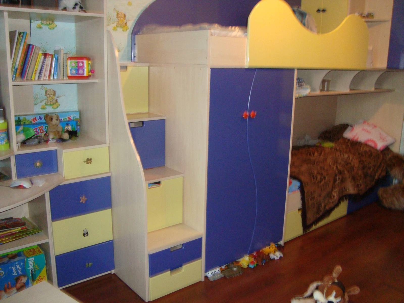 Цвет детской определяет активность ребенка. Под лестницей возможность хранения игрушек.