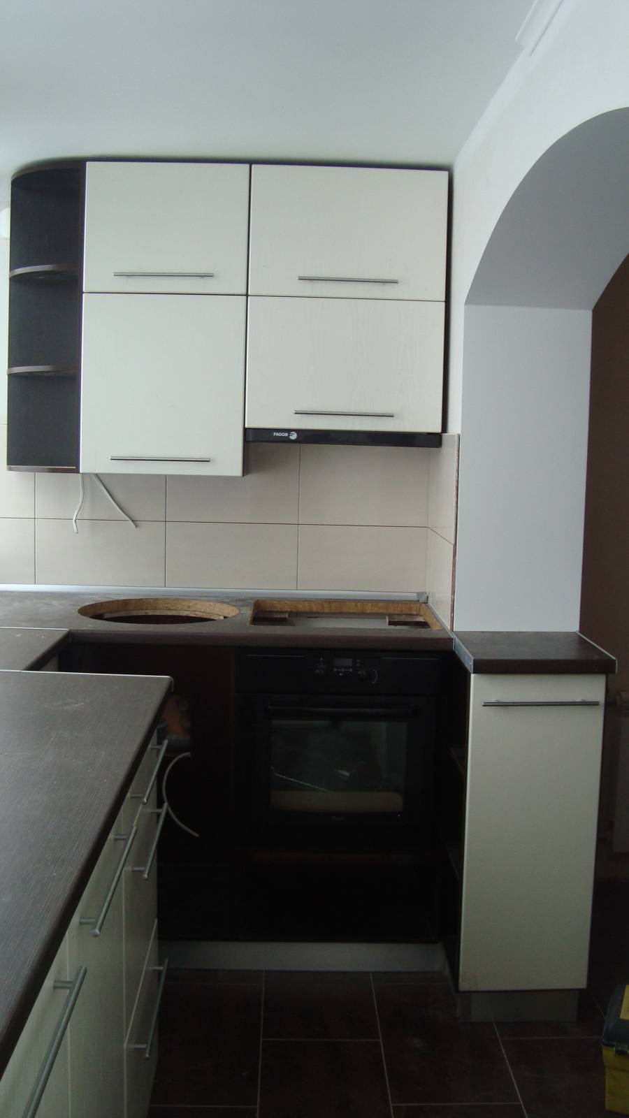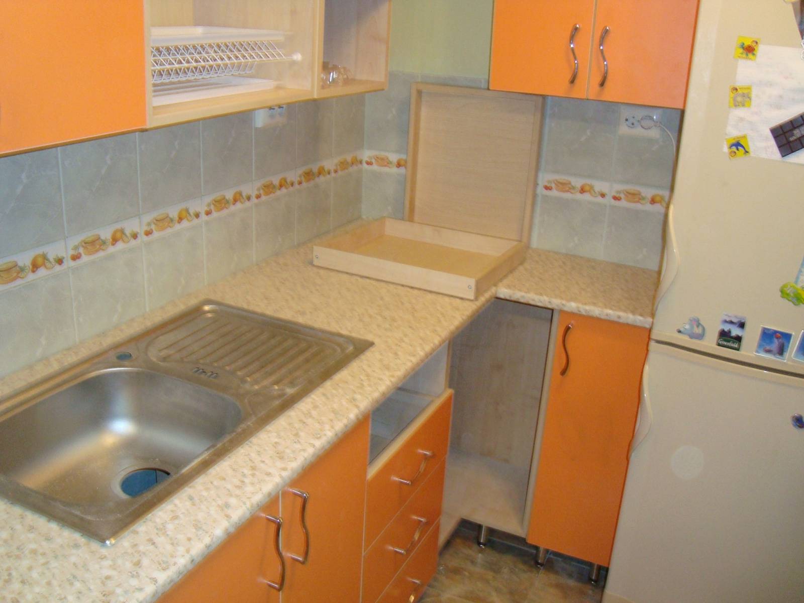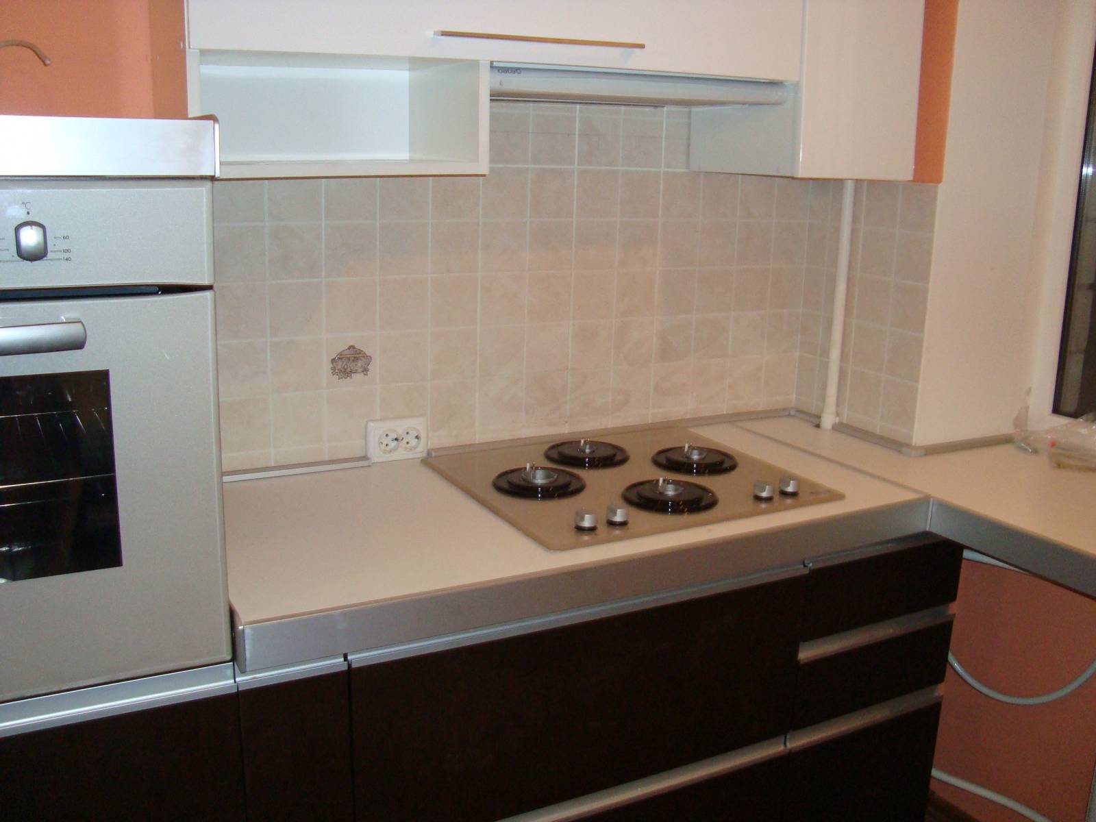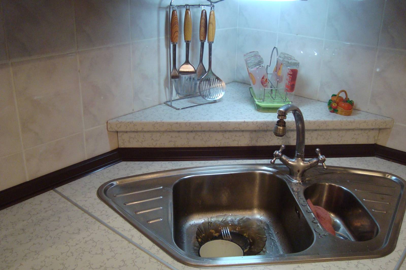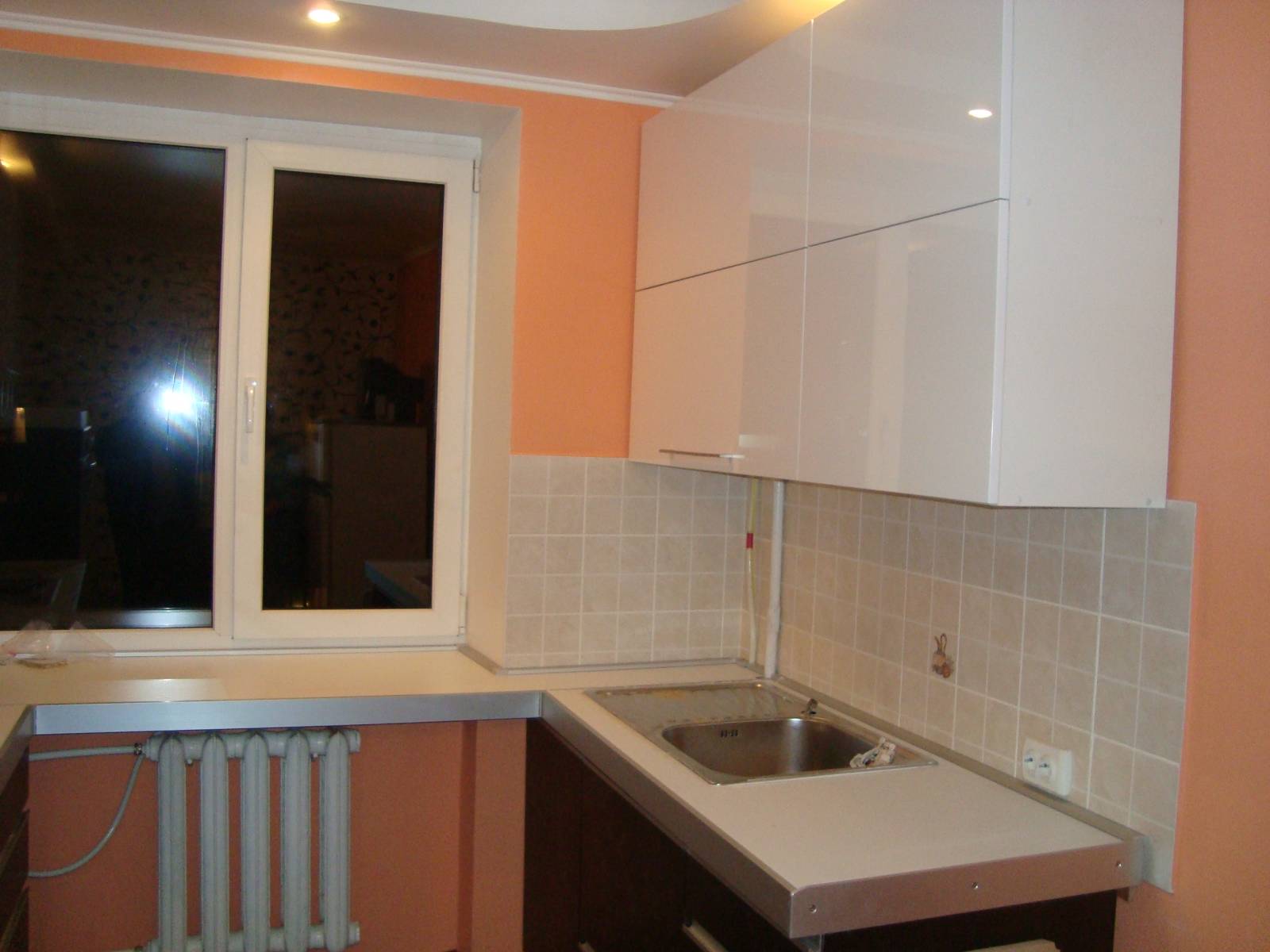 кухня фасад МДФ: низ-венге,верх-белый перламутр.Трепецывидный угол для мойки -маленький парапет- место для моющиц и д...