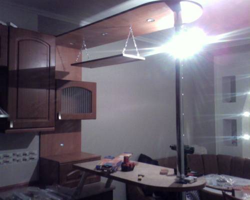 Кухня фасад МДФ-пленка, барная стойка, подвесная полка на цепке.