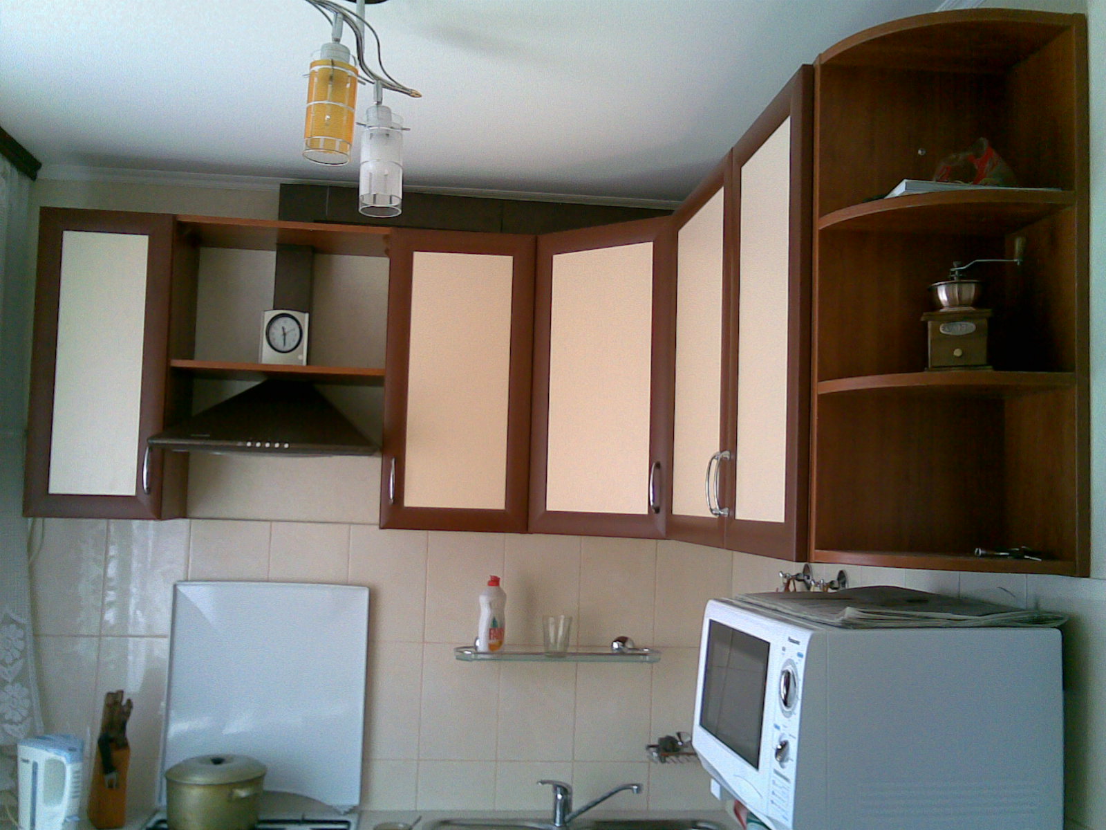 Фасады шпонированные "Венге", навесные шкафчики фасад -стекло алюминиевом профиле.
