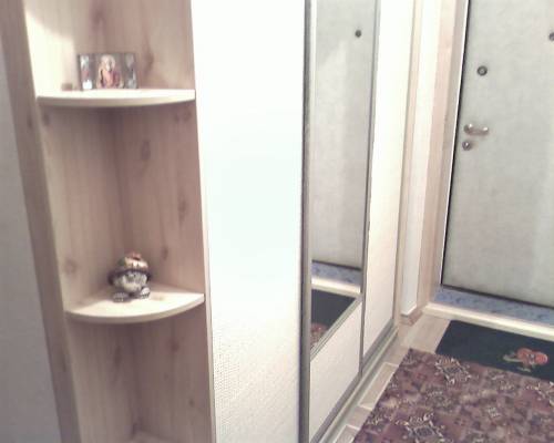 Шкаф-купе в прихожей :комбинирование ратанга с зеркалом. Ширина шкафа 250мм- раздвижная система "Браун Классик" - 50ммширина рельсы. Угловые радиусные полки при ходе на кухню.