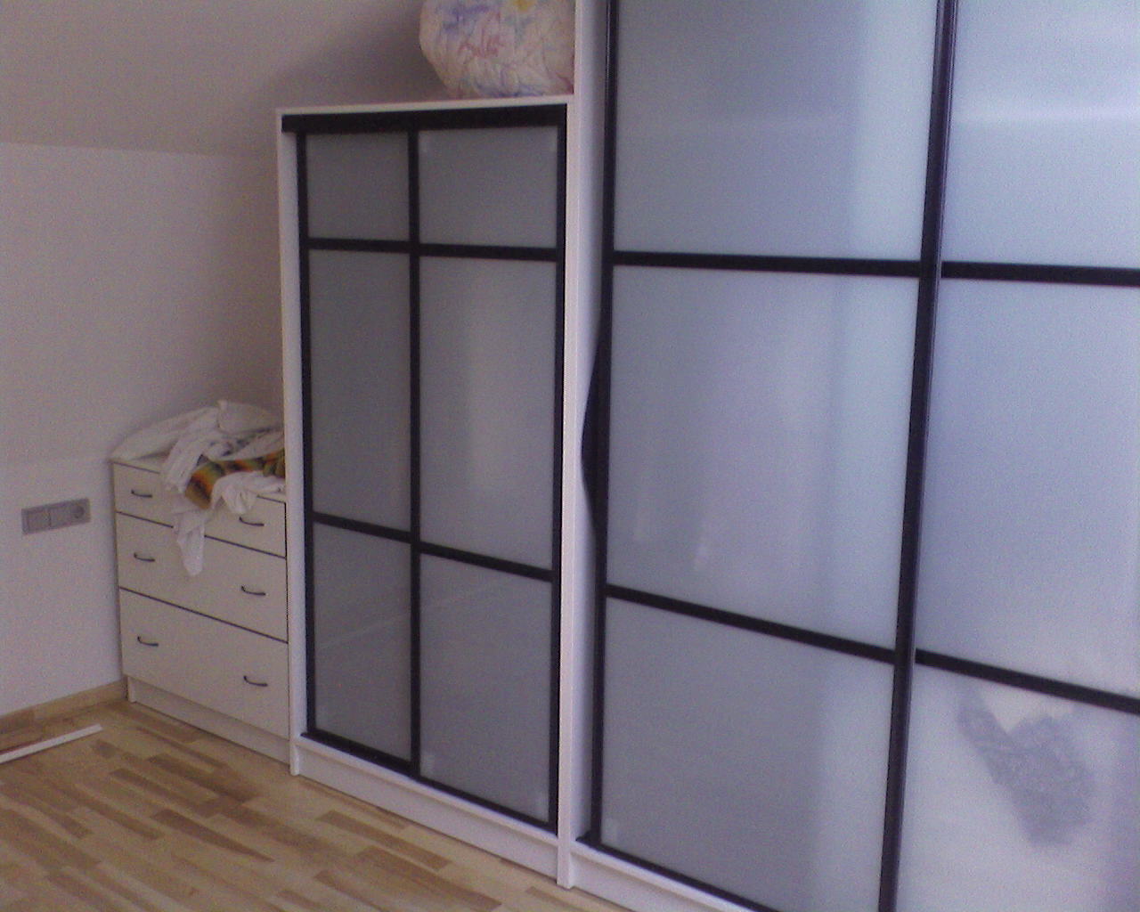 Шкаф-купе в спальне : стекло сатин, профиль черного цвета, зеркало внутри шкафа.