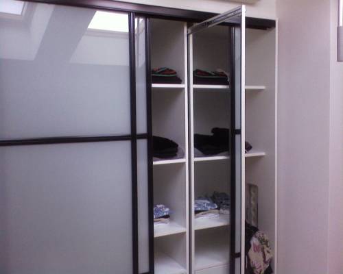Шкаф-купе в спальне : стекло сатин, профиль черного цвета, зеркало внутри шкафа.