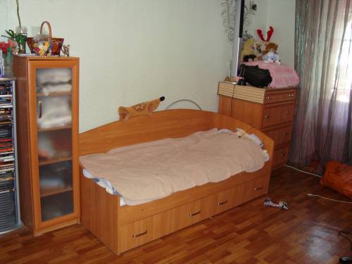 Пенал под стеклом-для вещей или посуды. Кровать одноместная с выдвижными ящиками. Комод.
