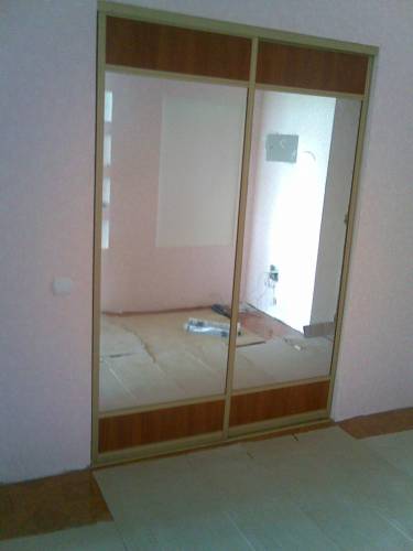 Перегородка - вход в гардеробную комнату.Раздвижная система "Браун" золотое покрытие,комбинирование ДСП яблоня и зеркало