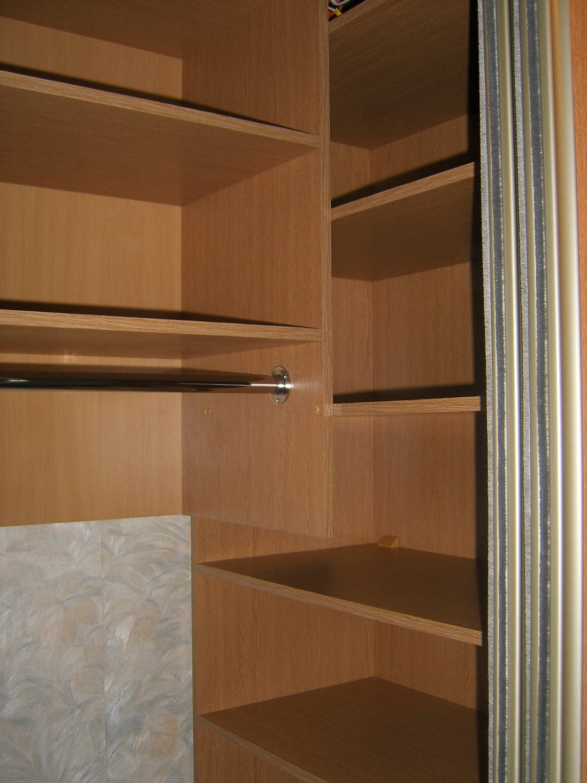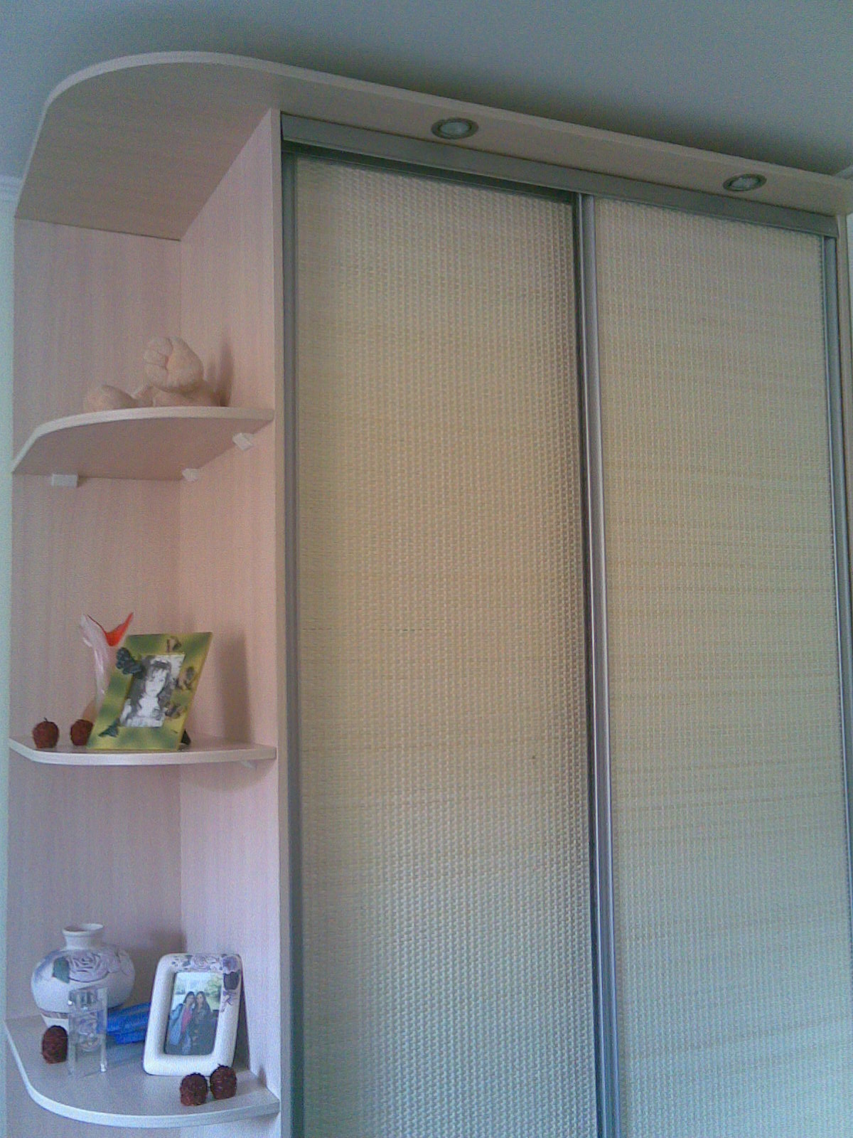 Купе в спальне :дсп-дуб молочный, фасад -ратанг натуральный,посветка галогенные лампы,полки радиусные открытые
