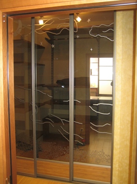 Перегородка - вход в гардеробную комнату.Раздвижная система "Браун" золотое покрытие,комбинирование ДСП яблоня и зеркало
