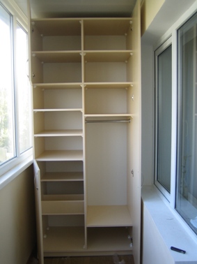 Шкаф одежный на балконе : отделение трепельное и полки для одежды и белья.