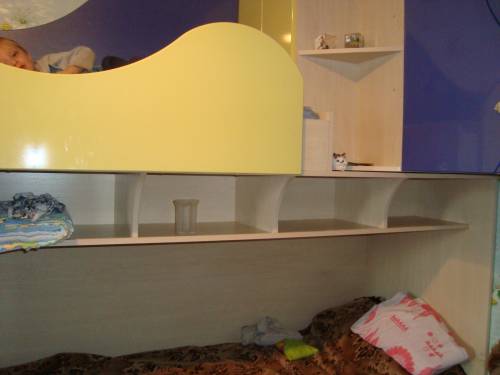 Детская комната с фасадами МДФ глянец пленка,двухярусная кровать.В нижней кровати ящики для белья,лестница в виде ящиков и секций для игрушек.Стол компьютерный с полками и ящиками.