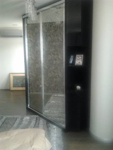 Шкаф-купе из глянцевого МДФ.разддвижная система Италия,хромированная.Фасад-зеркало с рисунком-отображена тюль-полностю дизайнерская работа.
