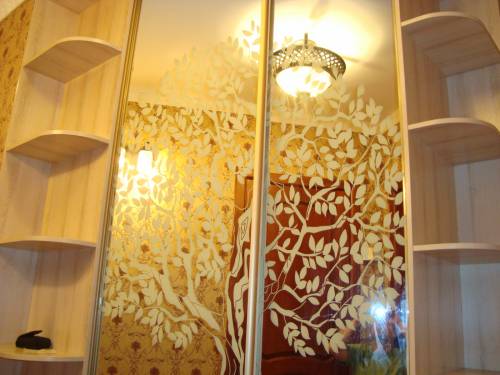 Шкаф-купе угловой,фасад зеркало с рисунком(рис.по эмольгамме зеркала)Дерево